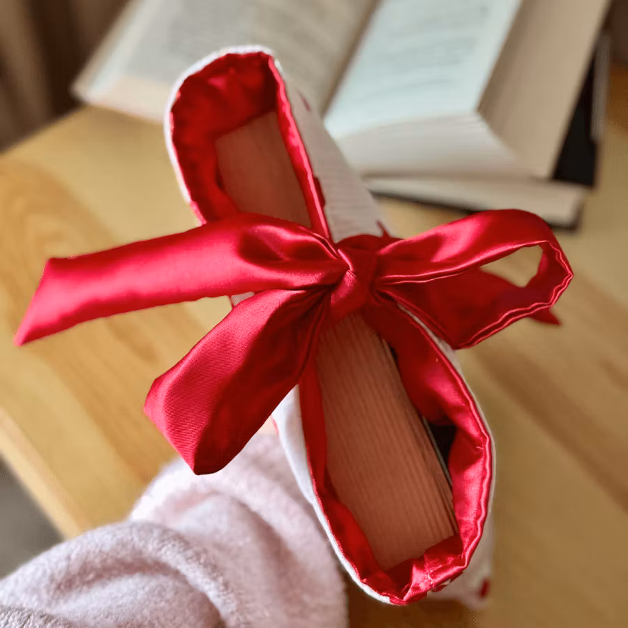 Yttertyget är i off-white bäckebölja med tryckta röda hjärtan, fodrad med ett rött innertyg i silke med matchande band.