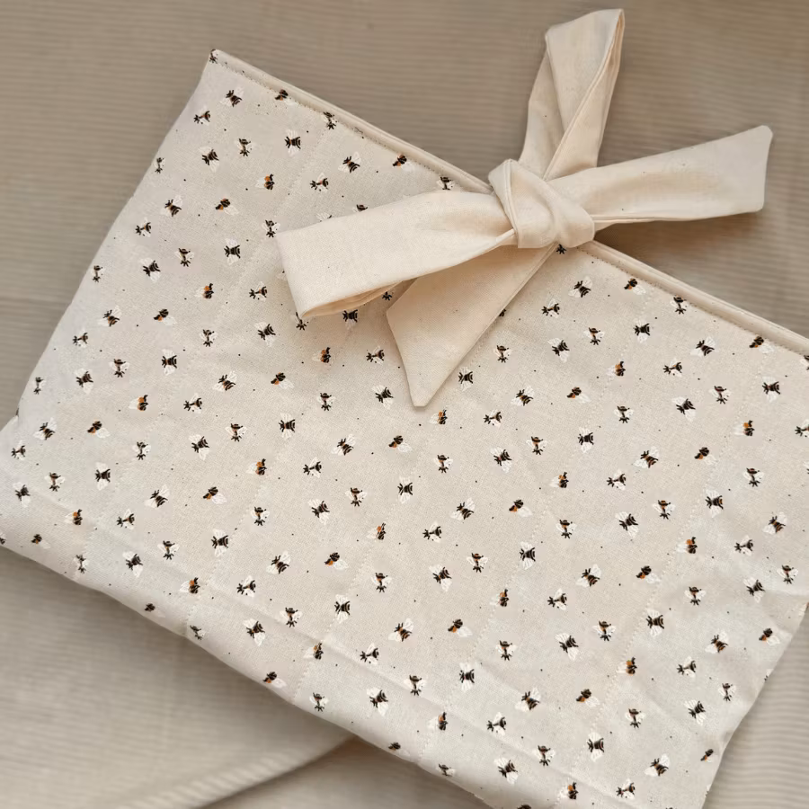 Humlor är ett populärt tyg i krämfärgad bomull med tryckta små humlor. Fodralet är fodrat med ett beiget innertyg i bomull med matchande knytband.