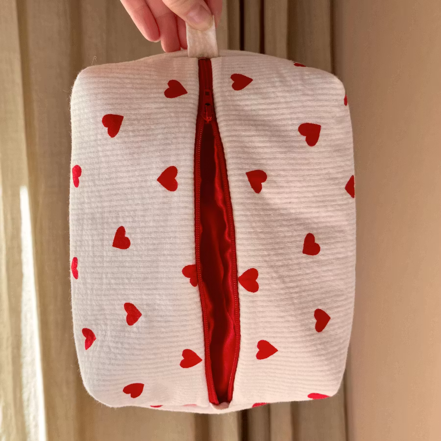 En söt necessär sydd för hand i mjuk bomullsbäckebölja av fin kvalitet. Yttertyget är i en ljus ton med röda hjärtan. Insidan är helfodrad i röd satin som ger en lyxig kontrast och ett vackert djup när du öppnar necessären. För extra stadga och hållbarhet är ett mellanlägg insytt, vilket gör att den står stadigt och behåller sin form fint över tid.