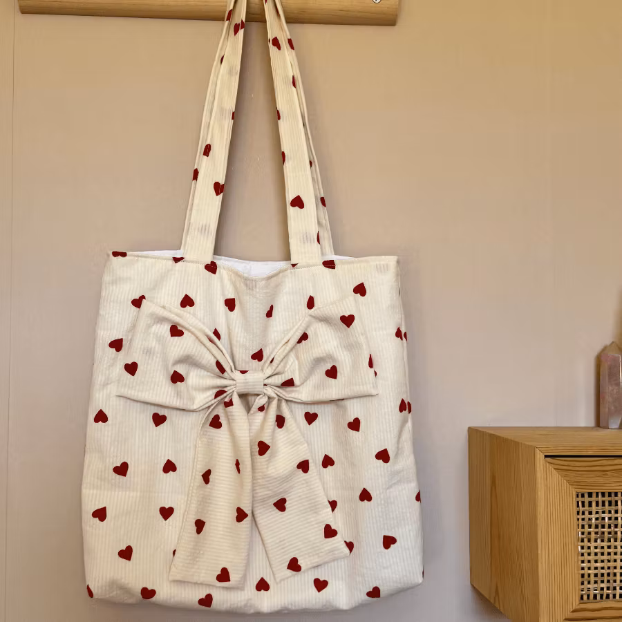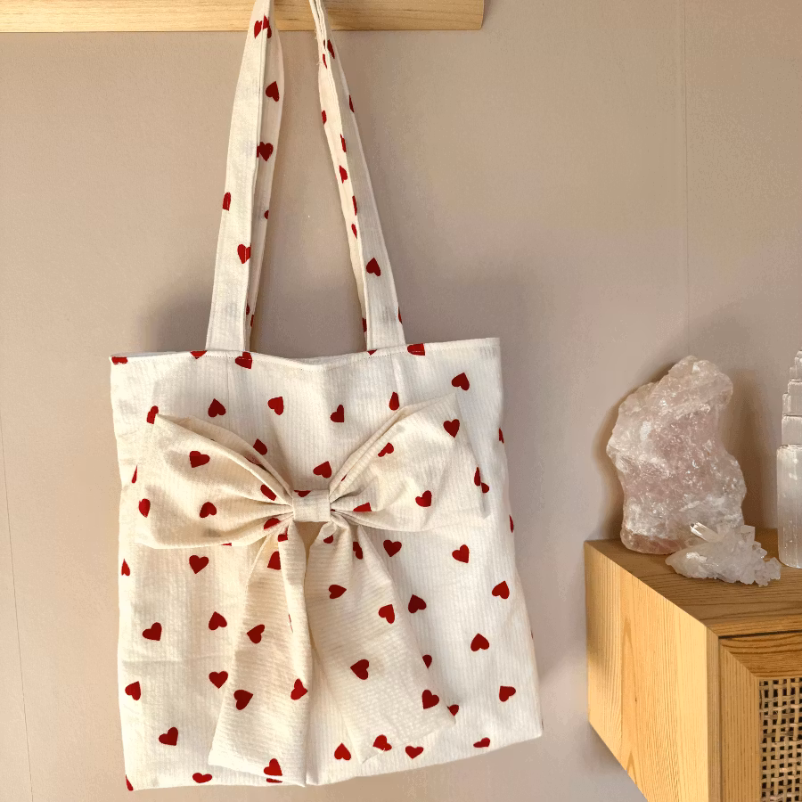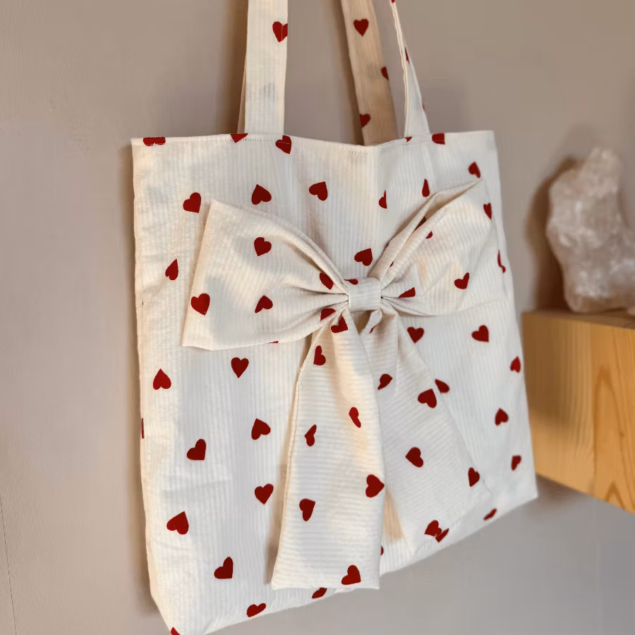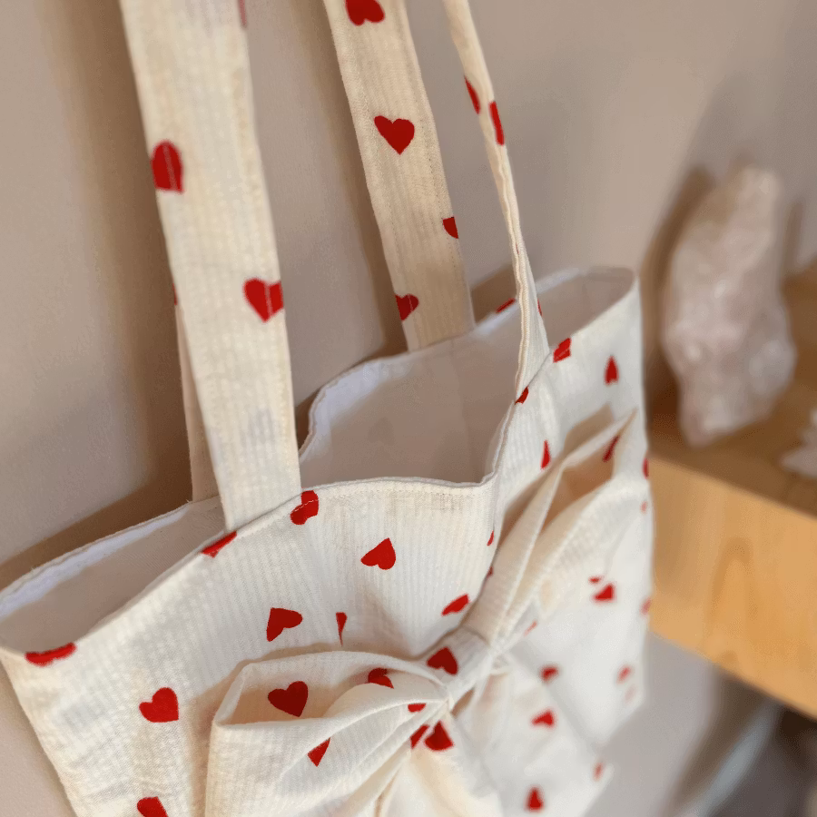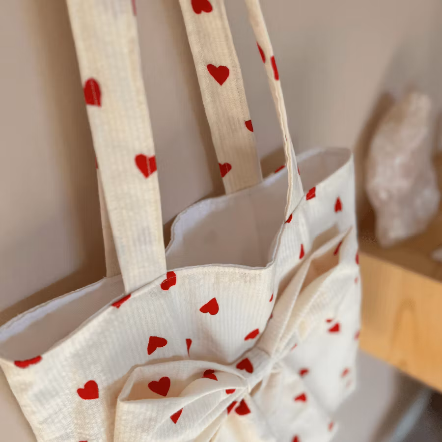 En charmig tygpåse som sys för hand när du beställer. Yttertyget är en mjuk bäckebölja i off-white, dekorerad med små röda hjärtan – en söt och tidlös design som passar året runt. Insidan är helfodrad med vitt bomullstyg för extra hållbarhet och en prydlig finish.