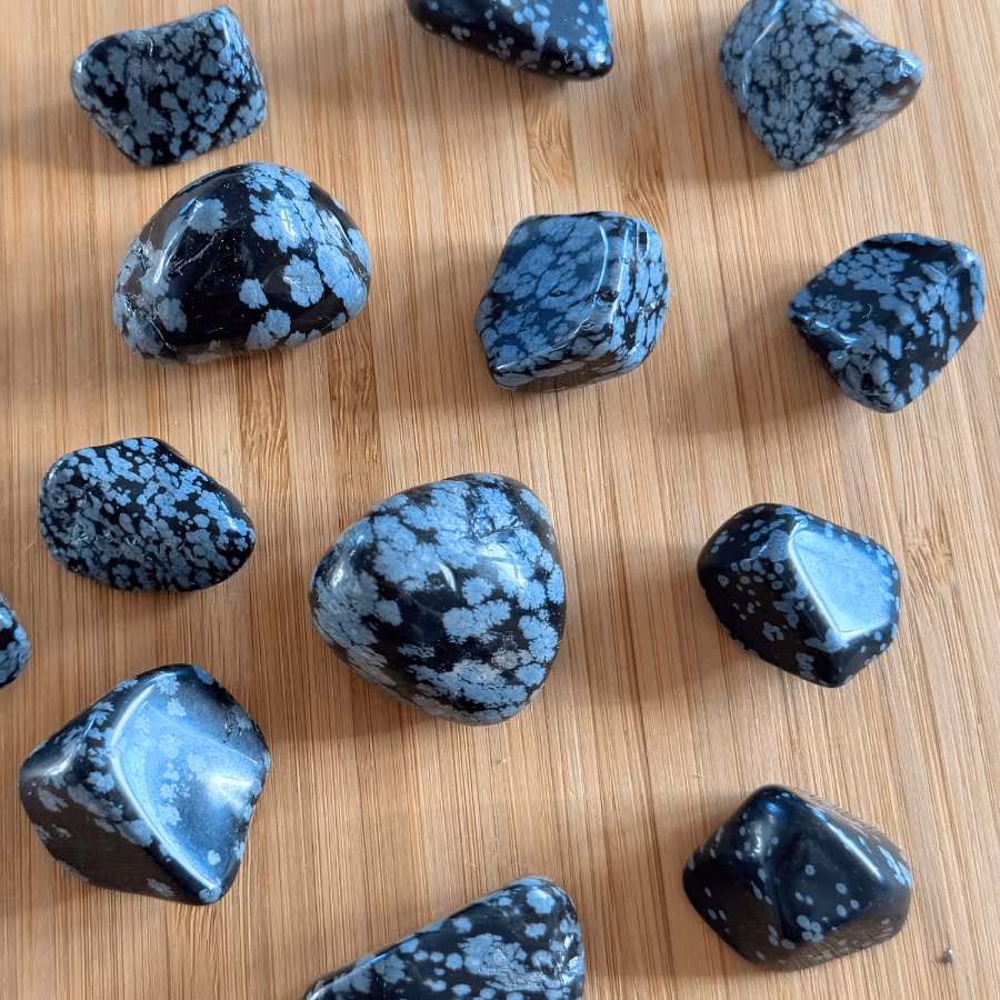 Snöflingeobsidian kommer från vulkaner och basen är svart obsidoian som bidrar till skydd mot negativitet. De vita snöflingsaktiga prickarna är kopplade till det andliga. Stenen bidrar därför till en god balans mellan jordelivet och andevärdeln. Dessutom har den en grundande och renande energi. Den sägs även skapa balans i själ, sinne och kropp. Stenen passar bra när du är redo för en förändring i livet eftersom den ger klarhet i olika situationer. Den hjälper till att väga både positiva och negativa aspekter och omvandlar det negativa till drivkraft.